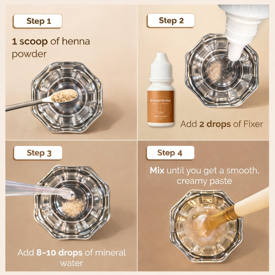 Le Fixer est une formule soin, stabilisante et à base d’eau, enrichie en ingrédients conditionnants tels que le panthénol et les protéines de blé hydrolysées.En pratique, l’avantage clé est le suivant : il rend le travail au henné nettement plus facile. L’application est plus contrôlée et plus uniforme, et le retrait est plus rapide et plus propre, sans frottement agressif.Pour la texture, la douceur et la stabilité, la formule comprend également des ingrédients de soutien tels que des émollients, des agents chélatants, des antioxydants et des conservateurs.